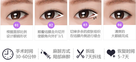 适合一般外眦过于圆润或眼睛短小的眼睛。通过将外眦打开,加长眼裂长度,放大眼外角弧度,提高眼睛美学效果。术后眼睛灵动可见,眼神清冽有神。